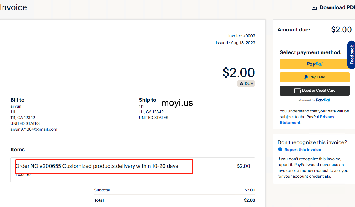 独立站直接下单就可以生成账单,并跳转到支付账单的界面,不需要再通过PayPal发邮件的模式,极大的简化流程。